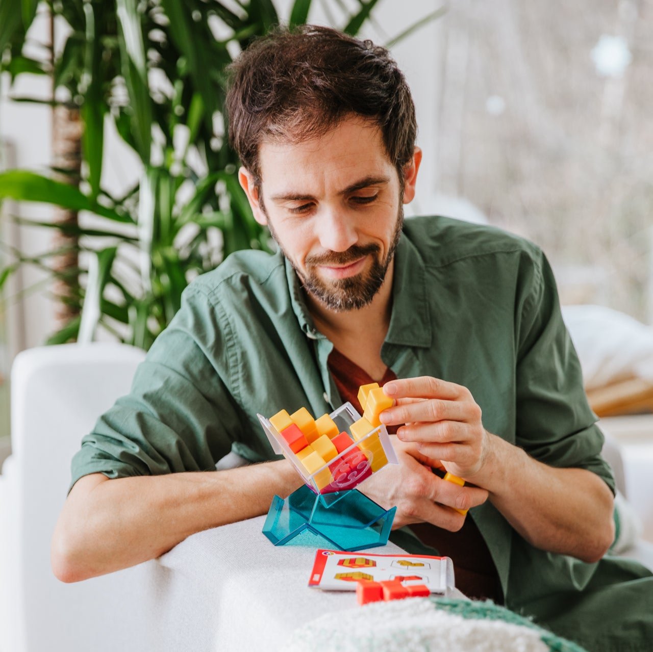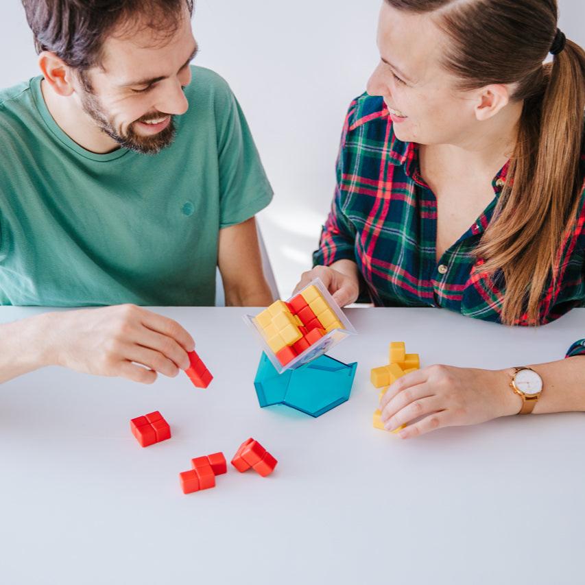 SmartGames Cube Duel is a 3D strategy game for two players. Place the red or yellow geometric pieces in the 3D gameboard so that the completed cube has more of your color exposed! Players must plan how to place their pieces - and react to their opponents' - from the very first move. What's more? In single-player mode you can develop 3D building skills with the 80 challenges included!