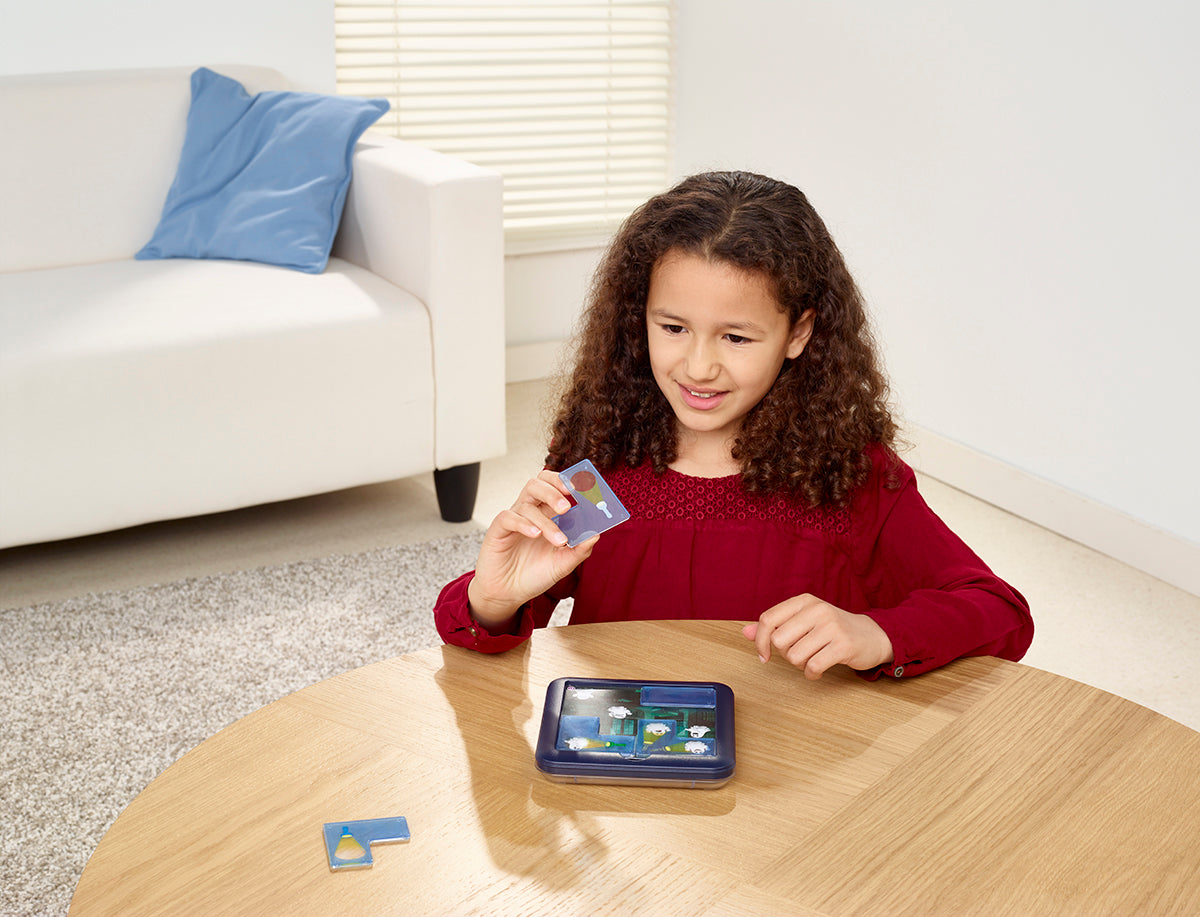 - Set Includes: 1 compact game board with transparent lid, transparent flashlight puzzle pieces, and cards with 60 challenges and solutions. Don't forget to download our free app with features that enhance the experience of physical SmartGames.