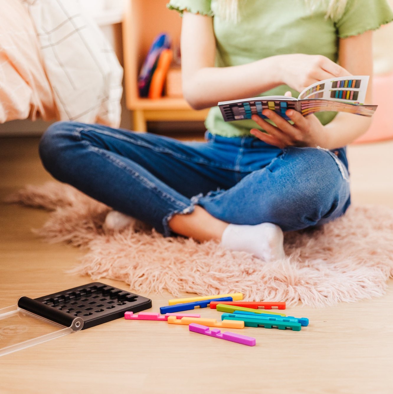 • Set Includes: 1 compact game board with transparent lid, 10 colorful numerical puzzle 'stixx' with indentations, and 1 booklet with 120 challenges and solutions.