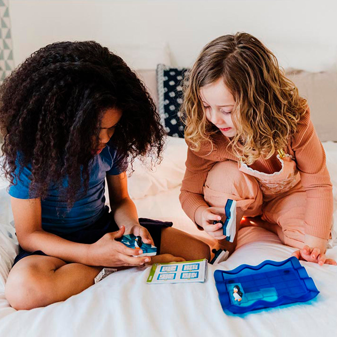 SmartGames Penguins on Ice is an award-winning, completely unique game based on ancient Greek Pentomino! Featuring puzzle pieces that shift in order to fit into place, players arrange the sliding ice blocks so that they all fit on the game board while making sure that the five penguins are in the right spots as shown in the included challenge booklet. With simple challenges for beginners to complex puzzles that will test experienced players, Penguins on Ice is a fun way to develop logical thinking skills and spatial reasoning abilities. 80 challenges, ages 6-Adult.